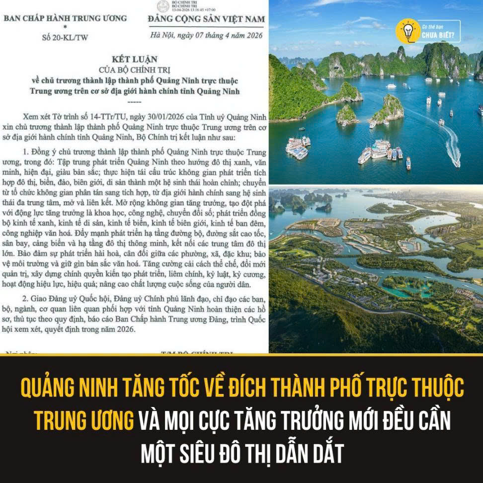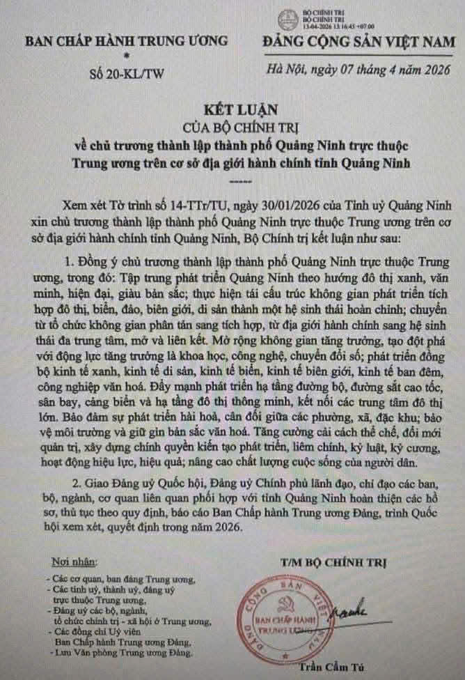 Ngày 7/4, Bộ Chính trị ban hành Kết luận số 20-KL/TW, đồng ý chủ trương thành lập thành phố Quảng Ninh trực thuộc Trung ương trên cơ sở địa giới hành chính của tỉnh hiện nay.