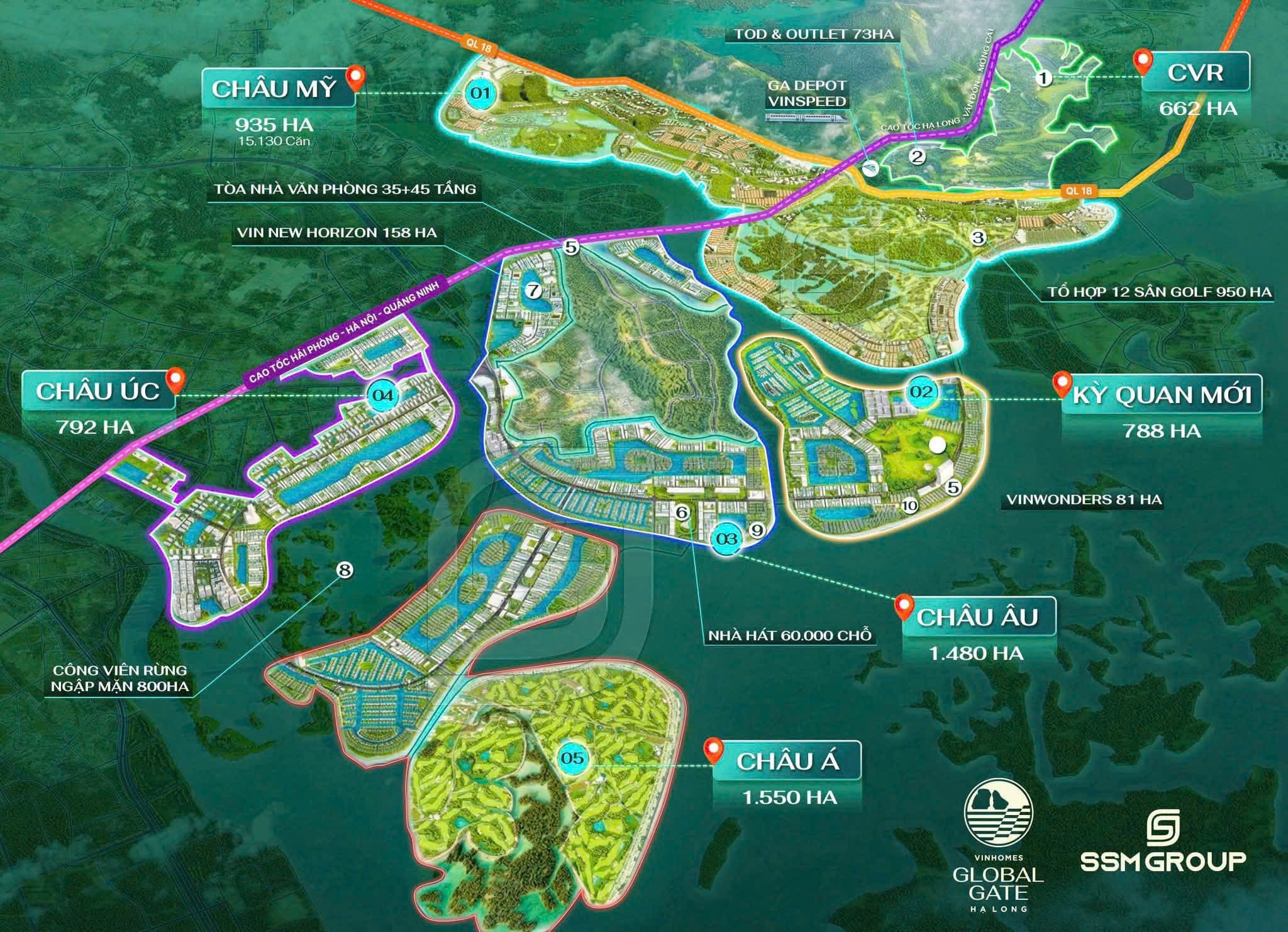Phân khu Châu Mỹ Vinhomes Global Gate Hạ long được chia ra làm 9 tiểu khu – 9 sắc thái sống riêng biệt.Cơ cấu sản phẩm: 13.314 căn biệt thự,shophouse+ liền kề.Trong đó có 1.334 căn biệt thự song lập, 221 căn dinh thự ,491 căn đơn lập.